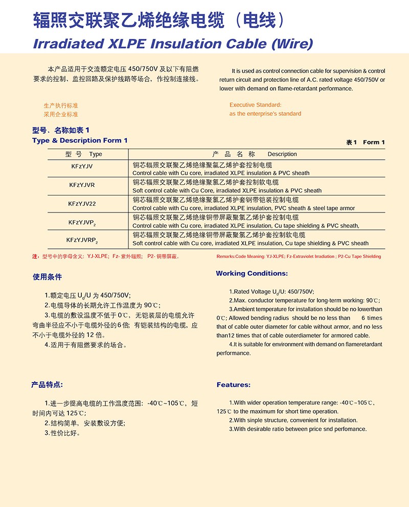 辐照交联聚乙烯绝缘电缆(电线)的产品详细介绍: